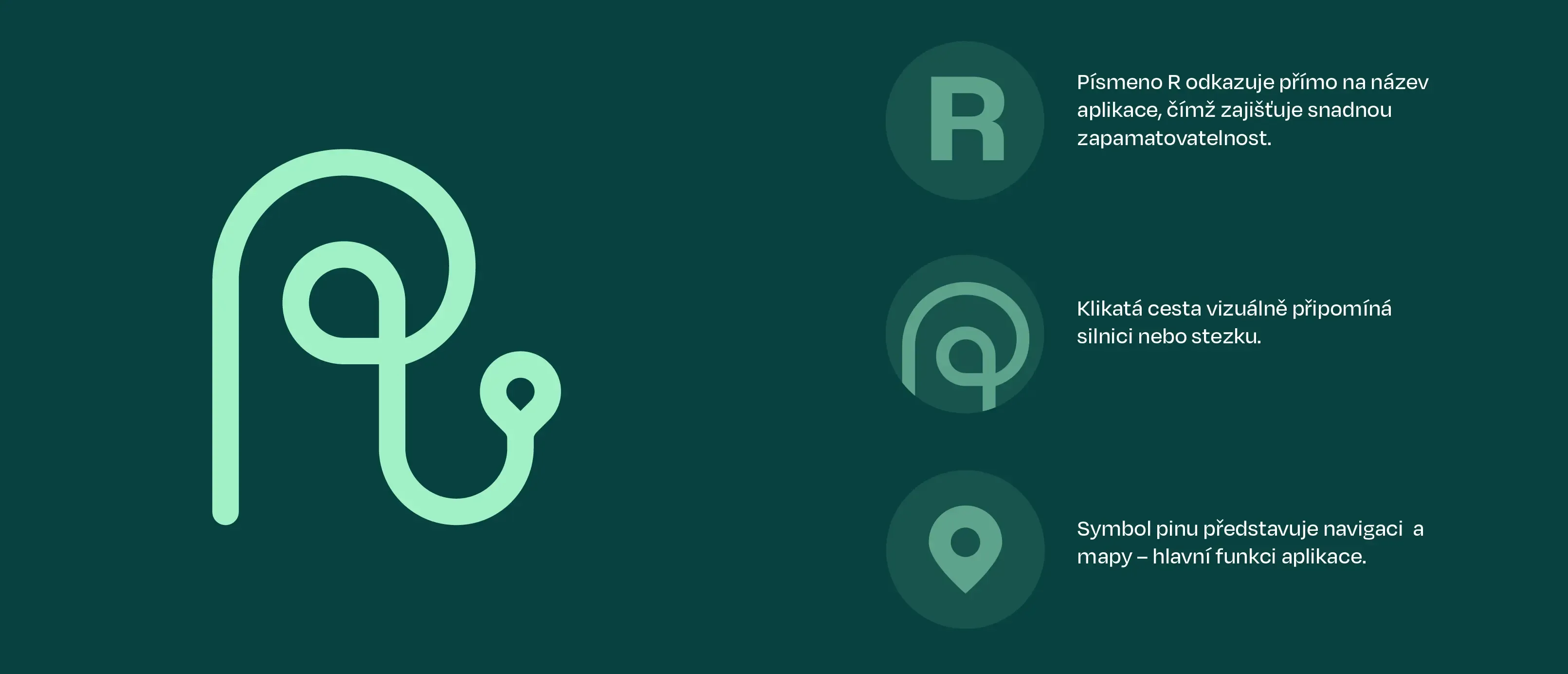 Logo vzniklo spojením tří klíčových prvků: písmena "R" , které tvoří jeho základ a odkazuje na název aplikace, klikaté cesty , která symbolizuje plánování tras a objevování cest, a ikony mapového pinu , která znázorňuje navigaci a lokalizaci. Minimalistický design zajišťuje snadnou rozpoznatelnost a dobře funguje v různých velikostech i aplikacích.