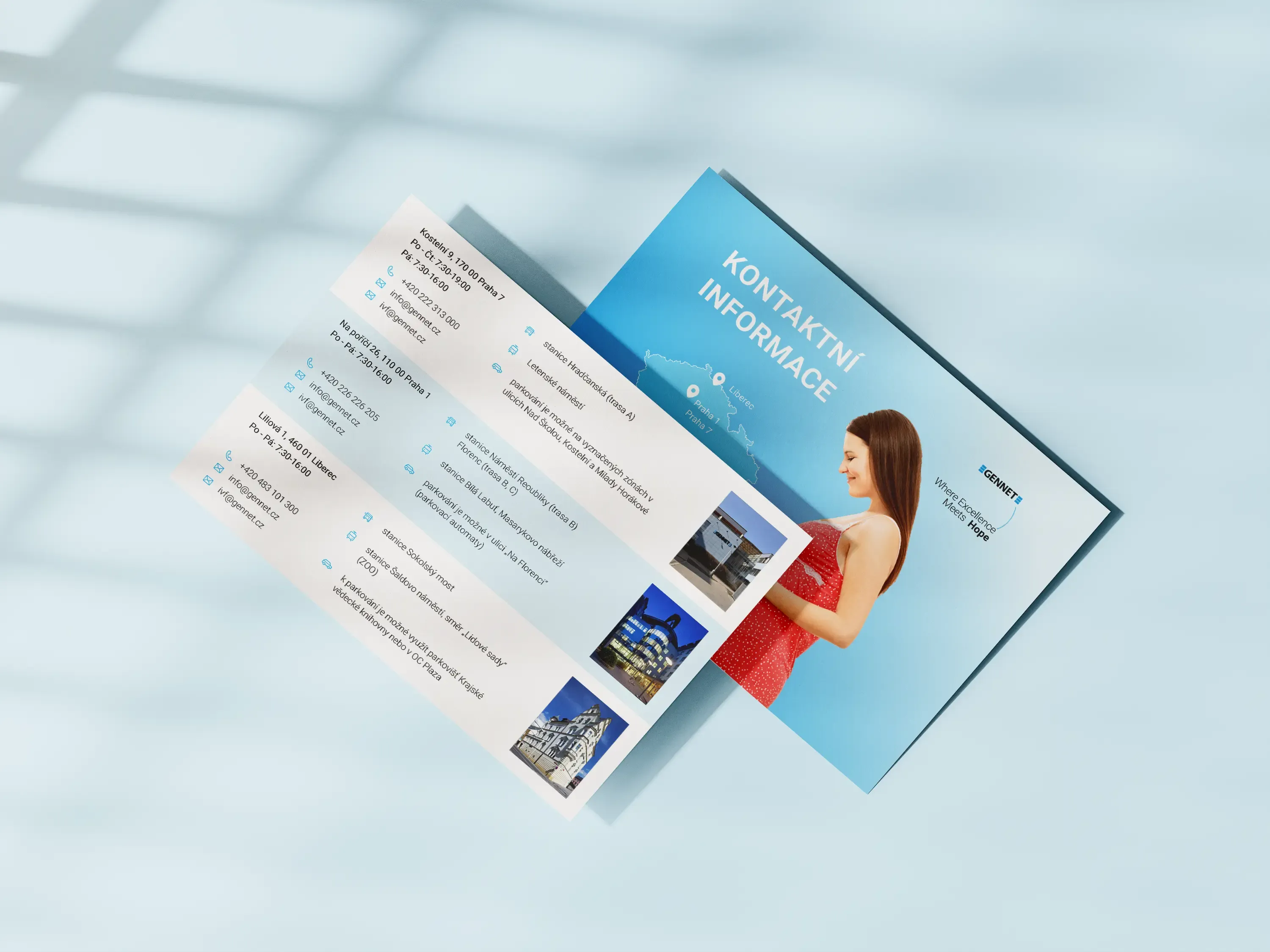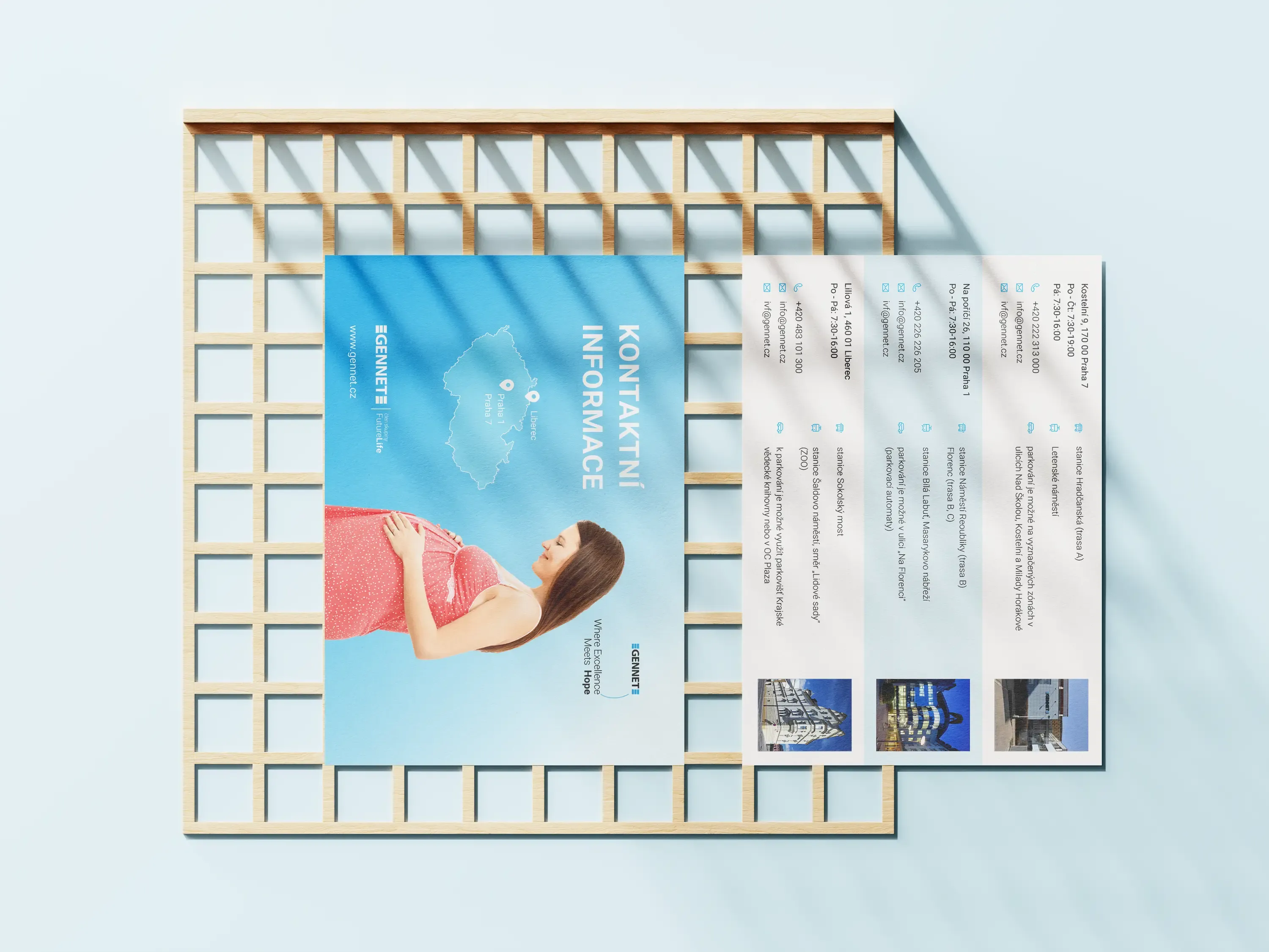 Pro společnost Gennet jsem vytvořila design informačního letáku. Na přední je vizuál těhotné ženy a mapa poboček, zatímco zadní strana nabízí detailní kontaktní informace pro snadnou orientaci. Design působí profesionálně a zároveň přívětivě.
